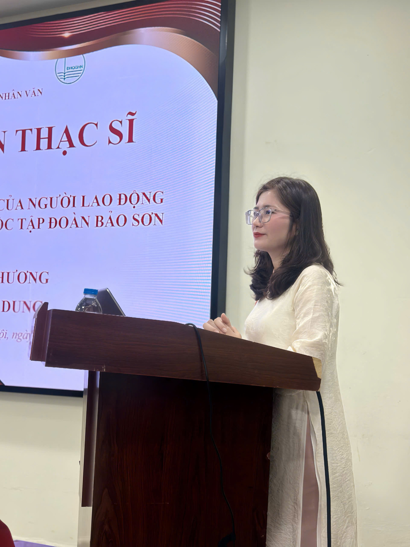 Tại buổi bảo vệ, học viên Nguyễn Thị Phương đã trình bày các nội dung chính của nghiên cứu, đồng thời trao đổi và làm rõ nhiều vấn đề học thuật được Hội đồng đặt ra. Với sự chuẩn bị nghiêm túc và tinh thần cầu thị, học viên đã tự tin trả lời các câu hỏi phản biện, thể hiện rõ quá trình nghiên cứu công phu và sự nỗ lực trong suốt thời gian học tập. Những nhận xét và góp ý từ các thành viên Hội đồng cũng đã giúp luận văn của nghiên cứu viên Nguyễn Thị Phương được hoàn thiện hơn cả về nội dung và giá trị thực tiễn. Buổi bảo vệ diễn ra trong không khí học thuật nghiêm túc, cởi mở, ghi dấu một chặng đường học tập và nghiên cứu đầy nỗ lực của học viên.